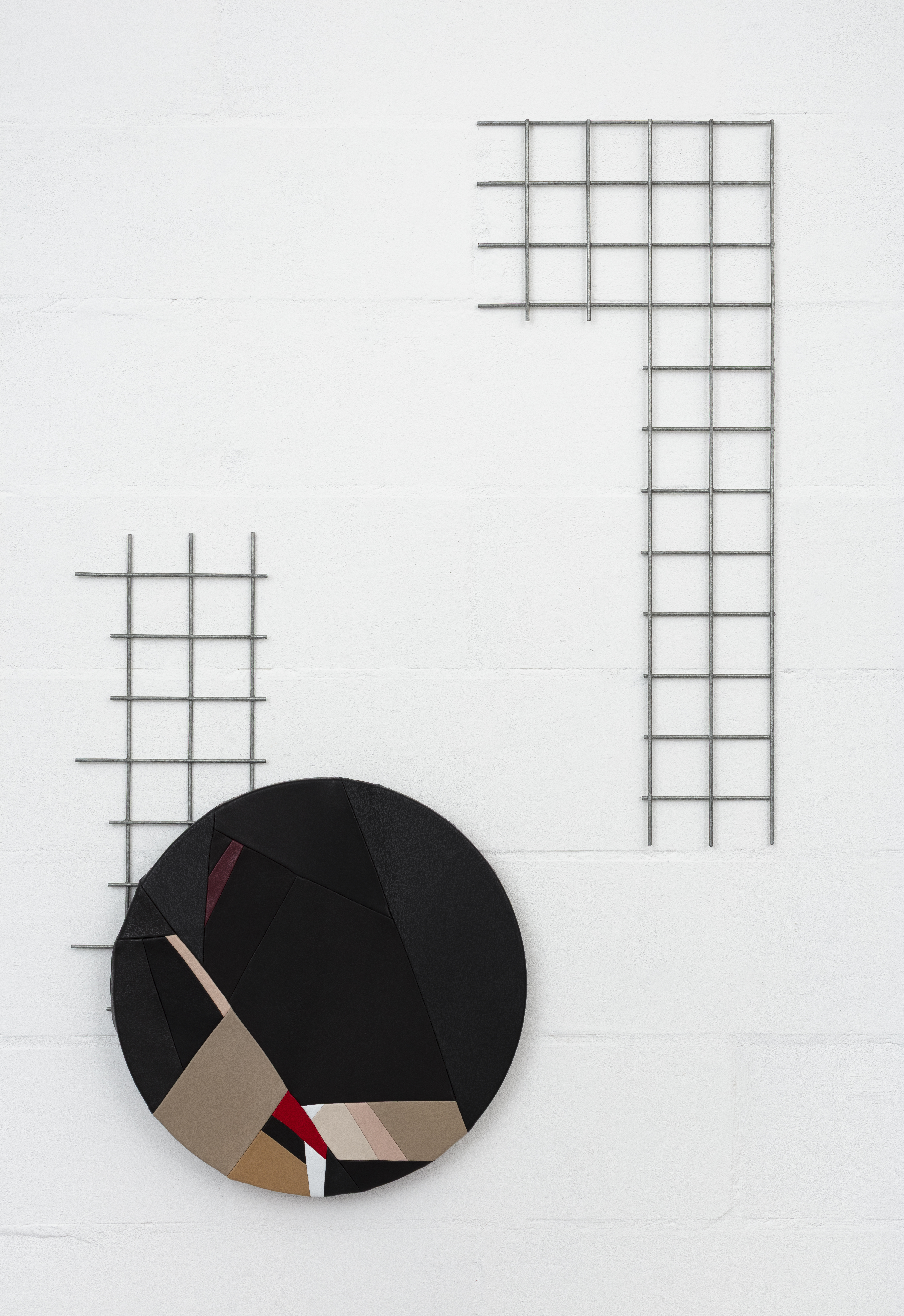 Gridded steel fragments extend this logic into the room, bringing the works into dialogue with architecture, while the leather resists, behaving like skin, responsive and difficult to fully stabilise. Installed as a constellation, the relational extends into display, insisting that meaning forms between things rather than within them, and is held, if only temporarily.